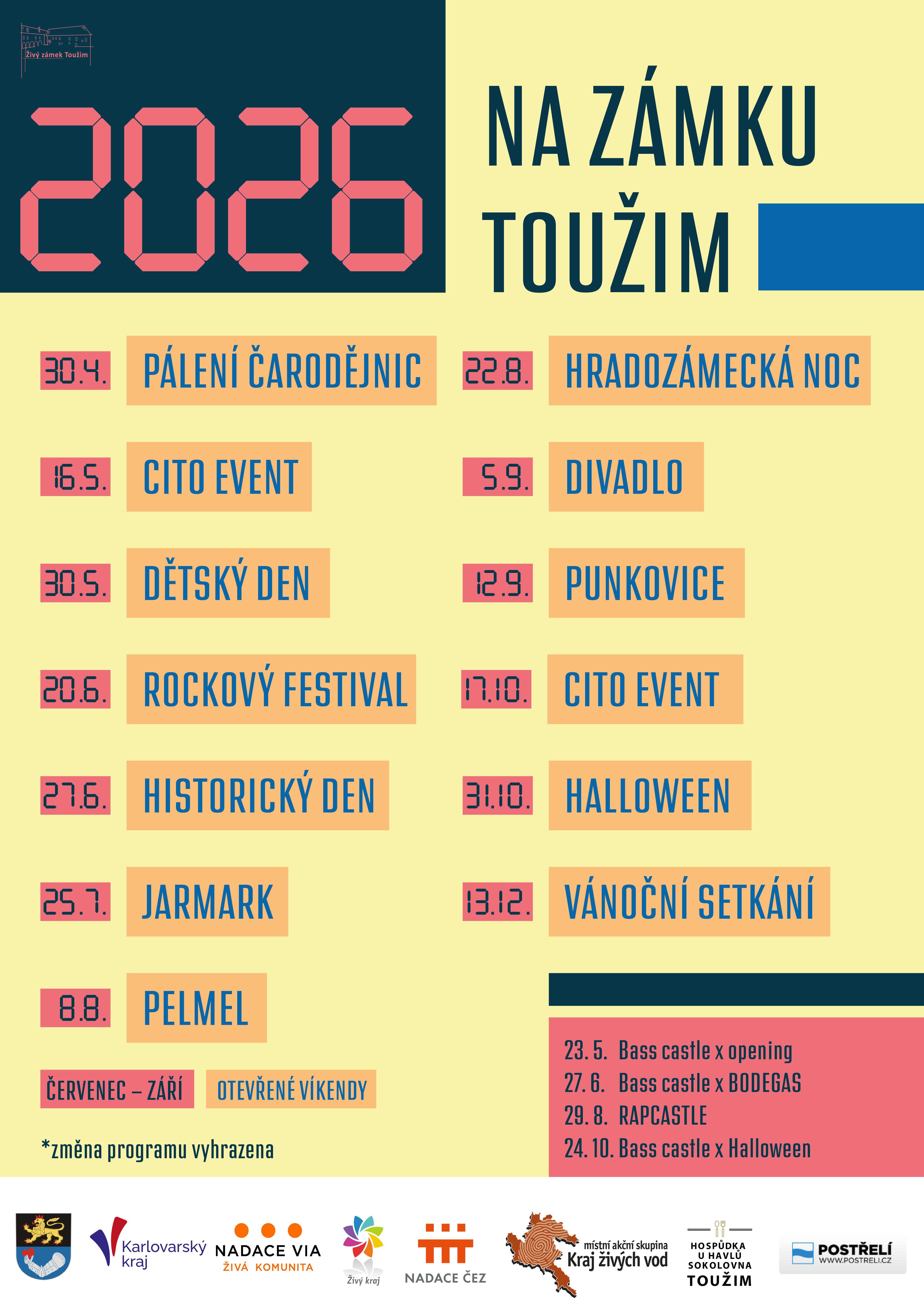 Živý zámek Toužim z.s. zveřejnil seznam akcí konaných na zámku pro rok 2026, viz příloha.