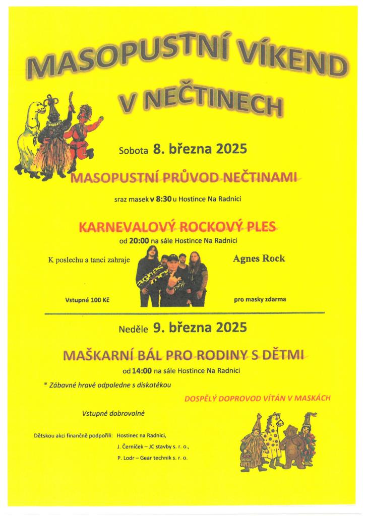 Pozvánka na masopustní průvod a Karnevalový rockový ples od 20:00 na sále Hostince Na Radnici