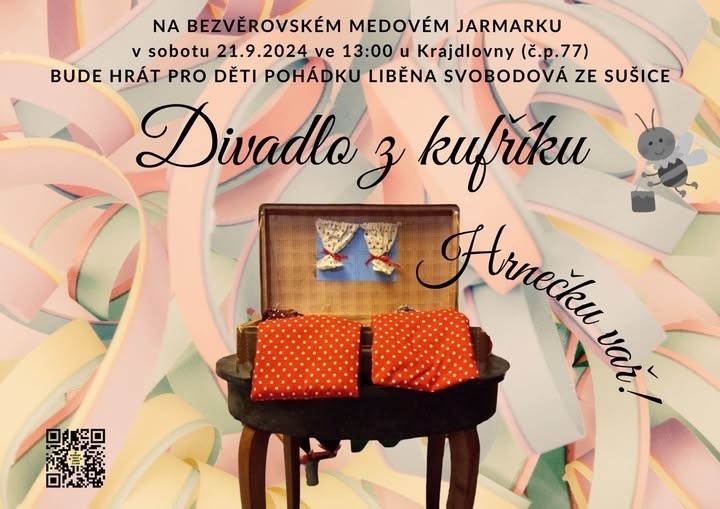 Děkujeme všem za návštěvu a účast na opět skvělém medové jarmarku v Bezvěrově dne 21.9.2024. Další ročník se bude konat 20.9.2025 na stejném místě. Pro účast a informace pište na bezverov.kultura@seznam.cz. Budeme se na vás opět těšit v Bezvěrově.